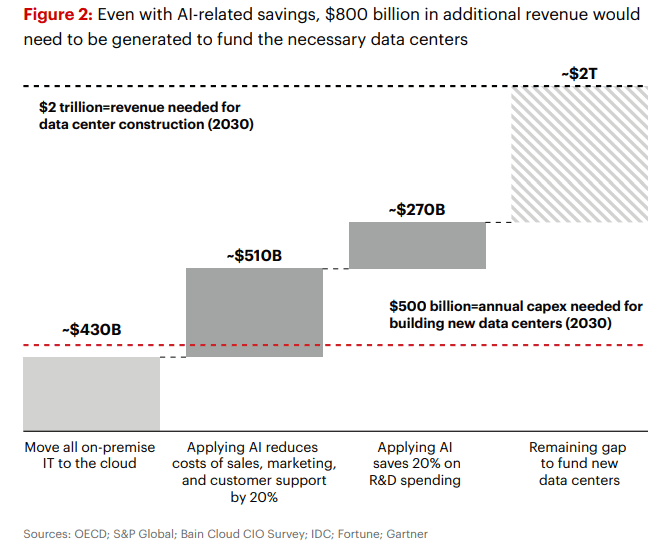 Bain projects data center investment will climb to $500B annually by 2030, generating $2T in revenue and savings. But AI demand is growing twice as fast, reaching an expected 200 GW globally, half in the U.S. After two decades of flat grid growth, this scale-up threatens to overwhelm infrastructure. Even if IT budgets went fully to cloud, the gap would still near $800B each year.